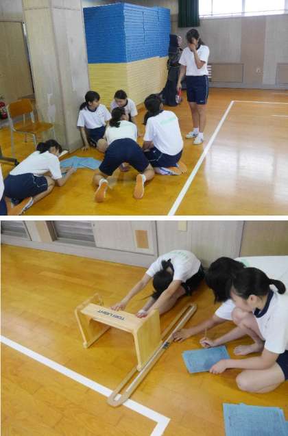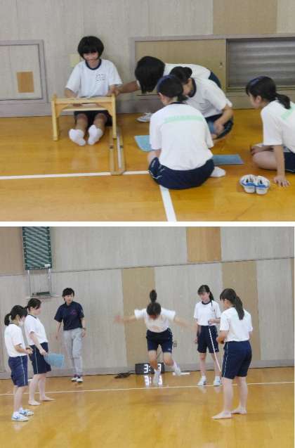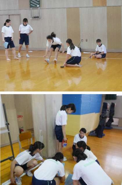 3年生の体育では、体力テストの計測をしていました。握力、長座体前屈、立ち幅跳びを計測しているところです。