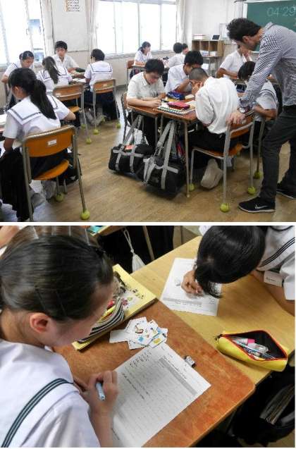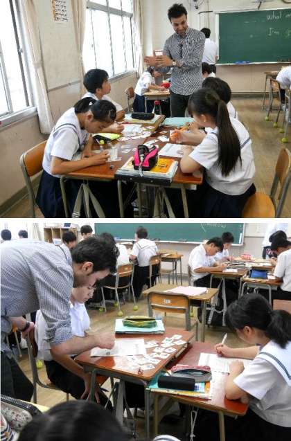 2年生の英語の授業で、ネイティブのサワディ先生が教えています。月〜日曜の朝昼夕に何をするのかスケジュールをたてて英作文を作ります。