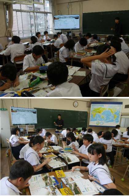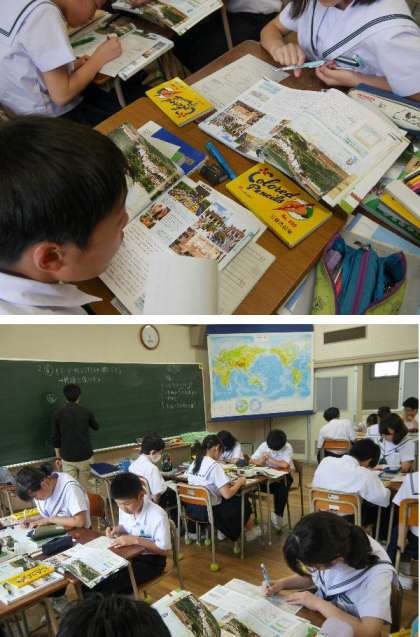 1年生の社会の授業です。教科書は地中海性気候のスペインのことを学習しています。オリーブやオレンジが栽培されているのは、乾燥しているから、乾燥に強い植物がつくられているんですね。降水量と気温をみるとわかってきます。