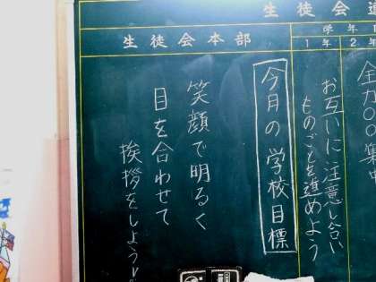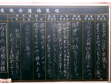 生徒会連絡黒板には、各種委員会で話し合わされた内容や、生徒議会できまった今月の目標が書かれています。