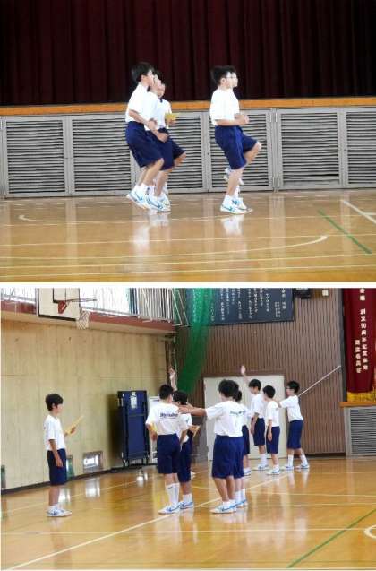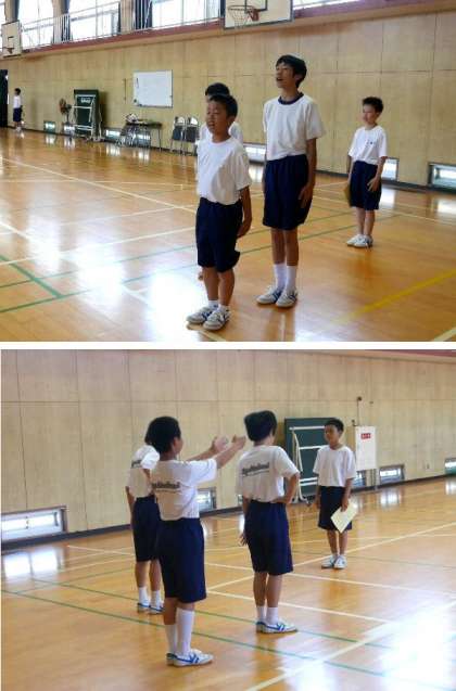 1年生の体育では、集団行動の基本練習をしています。生徒たちで子をかけあって整列したり方向転換したりチームで練習してがんばっています。