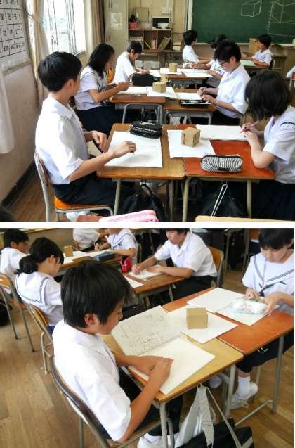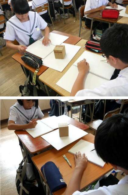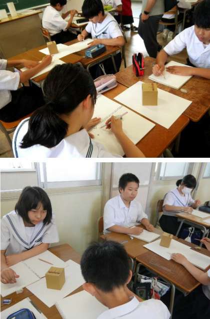 1年生の美術では、立方体を描いていました。立体に見えるように描くための方法もありますね。
