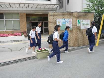 小学校へいくグループは、朝早くに集合して出発しました。がんばってね。