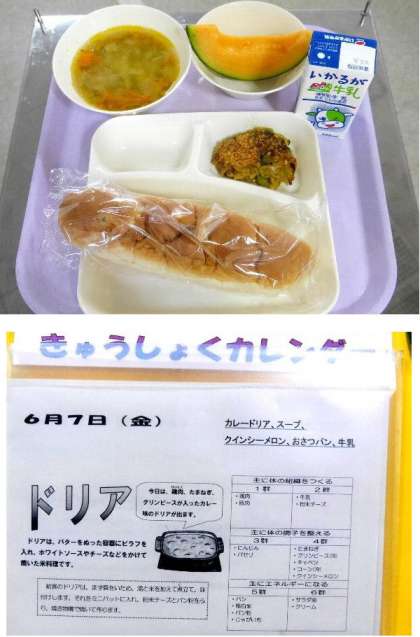 今日の献立は、おさつパン、カレードリア、スープ、牛乳、クインシーメロンでした。あまったメロンはじゃんけんでとりあいです。