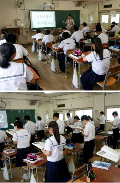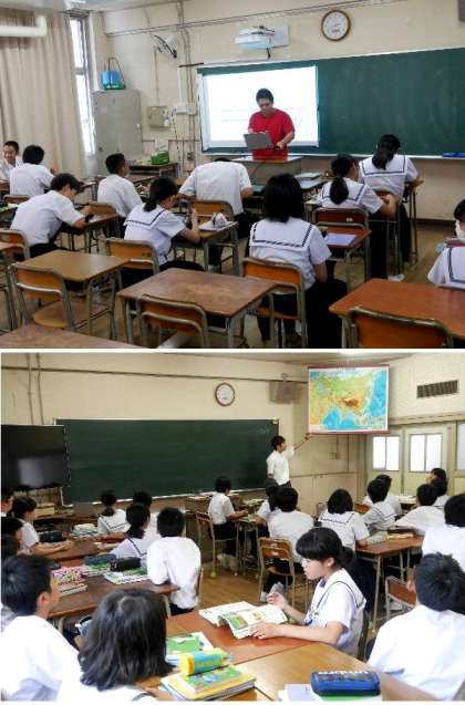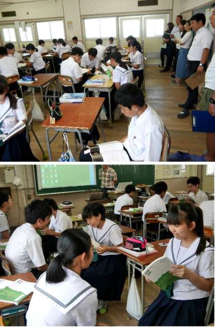 今日は5時限目で授業は終わりですが、3学級の生徒に残ってもらい、先生がたの研究授業が行われました。2年国語、1年社会、3年技術の授業が行われ、先生方が参観しています。