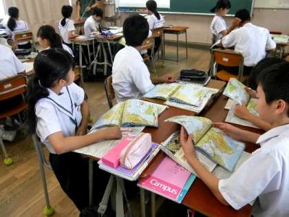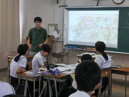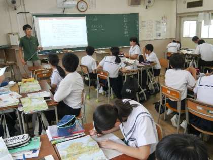 1年の社会は地理を学習しています。地図をみています。社会の質問をだして先生が説明しています。