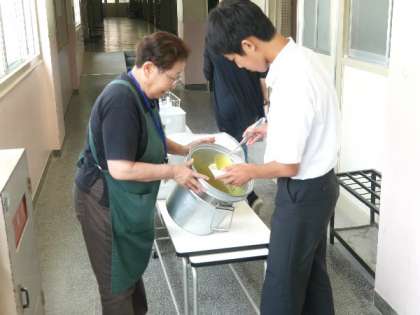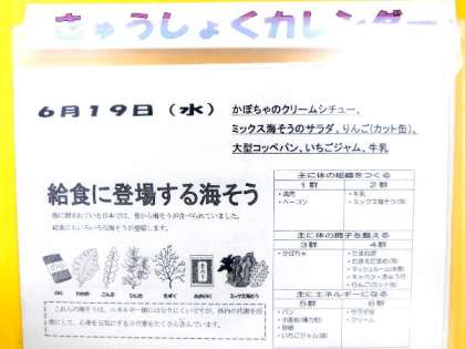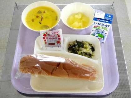 今日の献立は、大型コッペパン、いちごジャム、牛乳、かぼちゃのクリームシチュー、ミックス海そうサラダ、リンゴ(カット缶)でした。