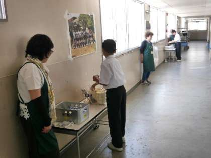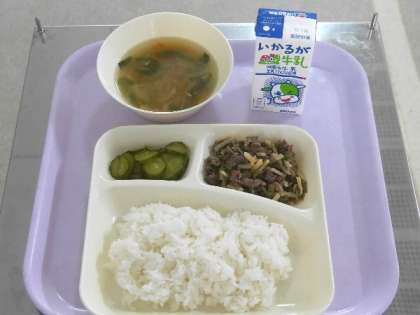 今日の献立は、ご飯、牛乳、チンジャオニューロウスー、ハムと野菜の中華スープ、きゅうりの辛みづけでした。今日もたくさんの元気アップボランティアさんにきていただきました。ありがとうございます。