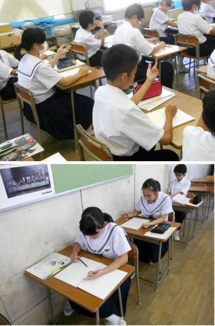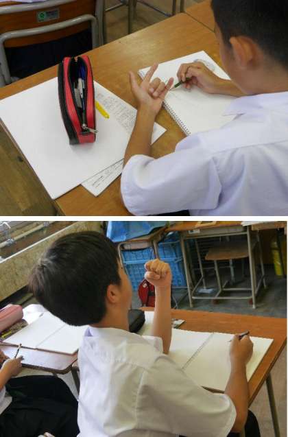 1年生の美術では、自分の手をスケッチブックにデッサンしていました。いろいろな指の形にして頑張っていました。