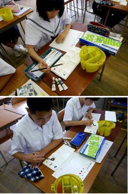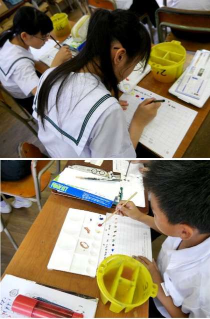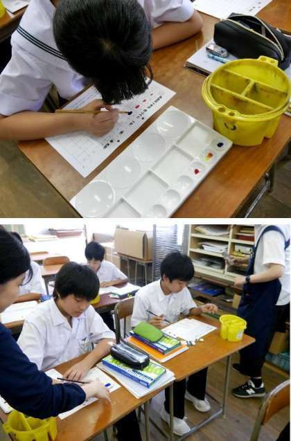 1年生の美術では色について学習しています。赤、青、黄色をパレットにだして、この3色の組み合わせでいろんな色を作っていました。できるだけたくさんの色を一生懸命に作り出して、用紙にぬっていっています。何色つくれたかな!