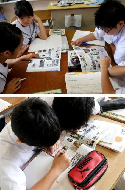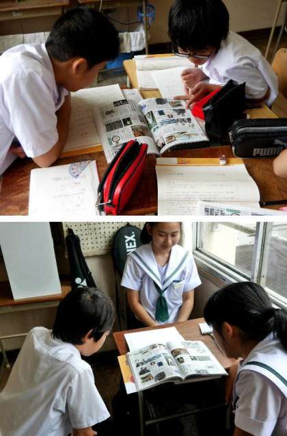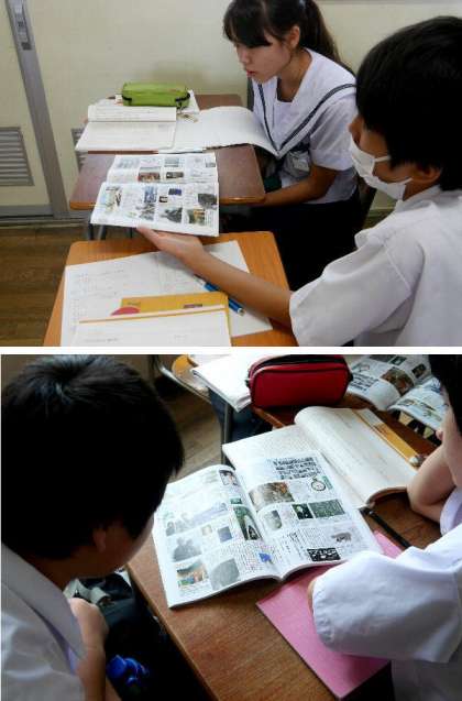 1年生の国語では、「字のない葉書」を学習しています。終戦の年、昭和20年の春の学童疎開についての内容です。国語便覧の資料で戦争についての資料をみています。小学校の修学旅行で広島にいった人もいて、興味深く見ていました。