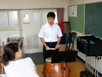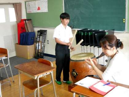 2年生の音楽でき和楽器について学習しています。和太鼓を楽譜にそってリズムよくたたいています。