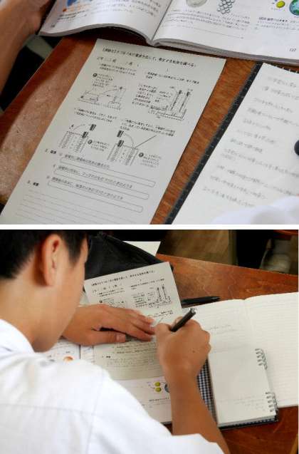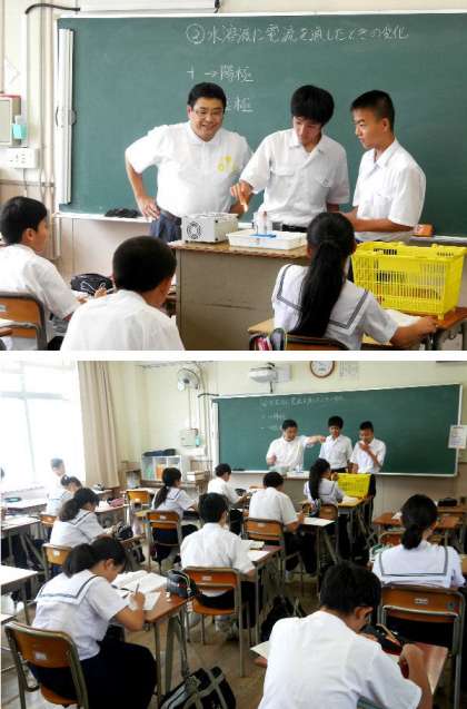2年理科の授業、前で実験しています。水酸化ナトリウム水溶液に電気を流すと気体が発生するんですね。さて何の気体でしょうか。まず、火を近づけてみています。