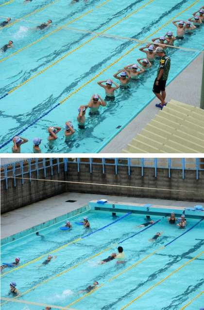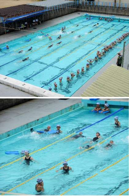 1年生の体育はプールで水泳をしています。男女とも基本から練習をしていきます。