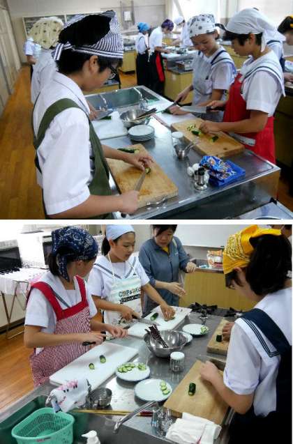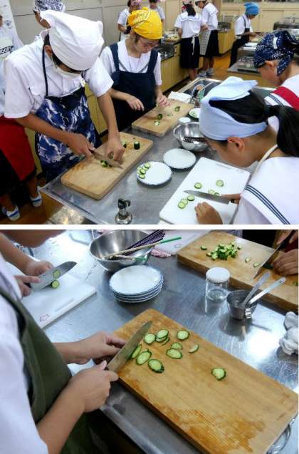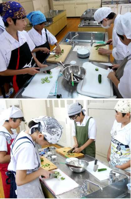 1年生の家庭科の調理実習です。キュウリを使って、いろいろな切り方を実習しています。