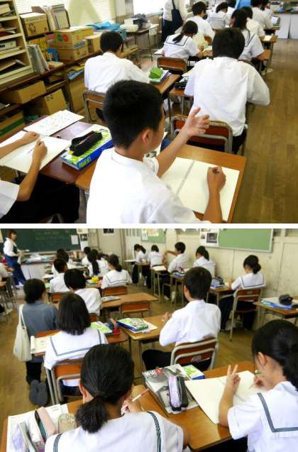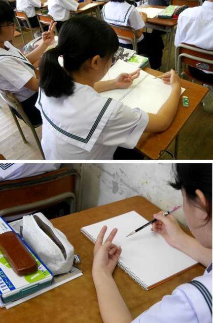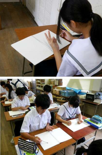 1年生の美術では、自分の手をモデルして描いています。どんなポーズがいいかな。