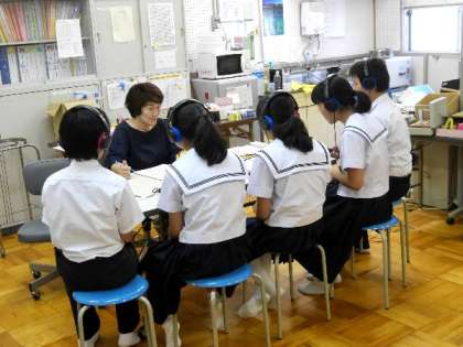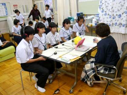 各学年ごとに、保健室で聴覚検査を保健室の先生がしています。音が聞こえたらボタンを押します。