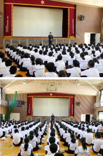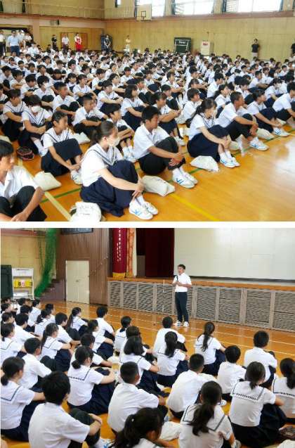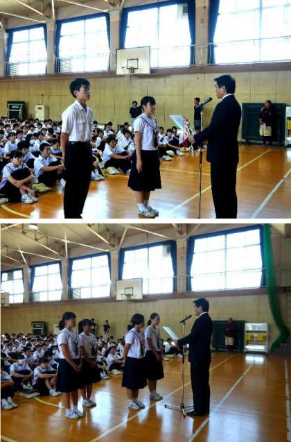 2学期スタートの始業式です。吹奏楽部、バドミントン部、テニス部の表彰を行いました。よく頑張りました。2学期は体育大会と文化発表会の大きな行事もあります。3年生は進路を選択する大切な時期となります。今まで積み重ねてきた成果をだし、実りあるものとなるように、まずは、体調を整えて、ゆっくりと取り組んでいきましょう。