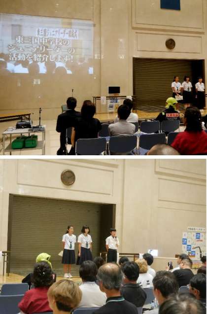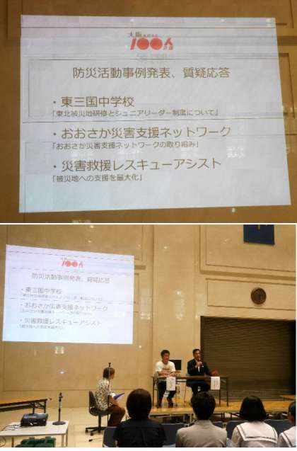 9月1日(日)、大阪市役所のロビーで、大阪を変える100人会議 第8回オープンフォーラムの防災活動事例発表で、東三国中学校のジュニアリーダが東北研修について発表しました。