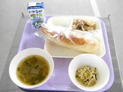 今日の献立は、鶏肉のからあげ、とうがんの中華スープ、切干だいこんのごま辛みづけ、おさつパン、牛乳でした。