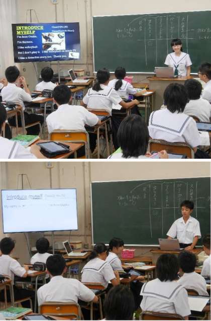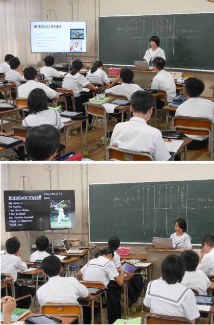 1年英語の授業では、タブレットを使って、自己紹介を英語で作っていました。そのプレゼンの発表会を教室でおこなっていました。