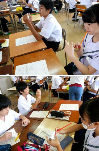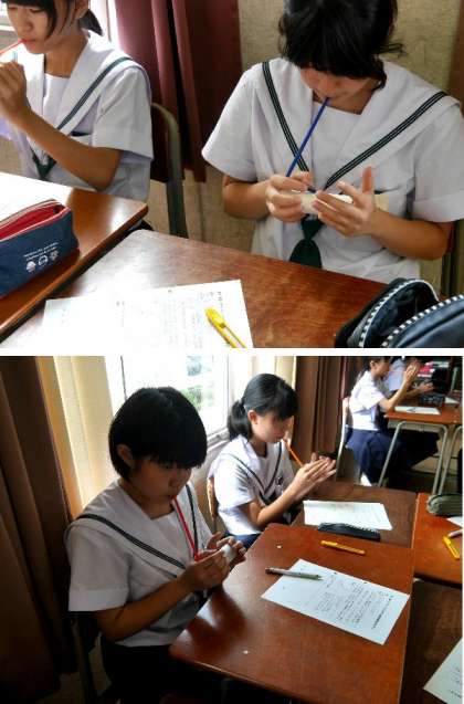 1年生の音楽の授業です。トイレットペーパーの芯をもとよって、穴をあけてストローをとりつけると笛ができあがりました。上手に吹くにはコツがいりますね。いい音色をならせることができたかな。