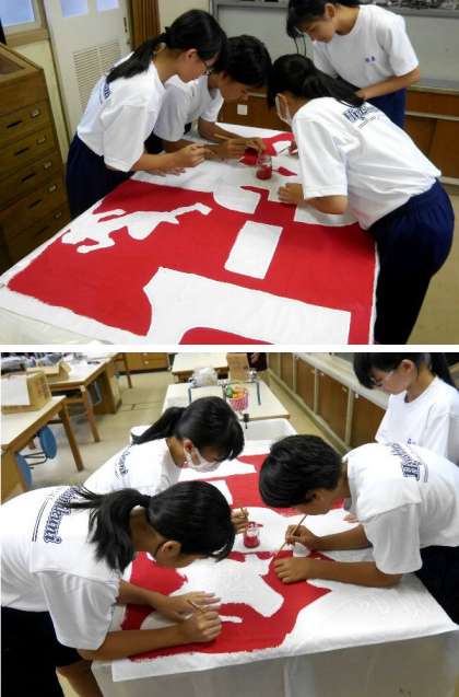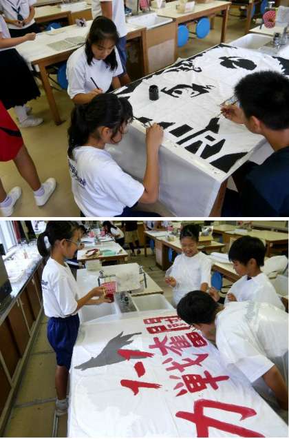 昨日から、放課後に、体育大会の各学級旗づくりが始まりました。デザインは各学級で夏休みの課題になっていました。色あざやかに目立つように丁寧に色ぬりをしています。
