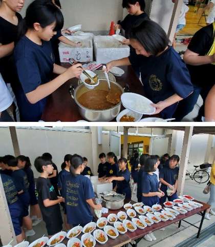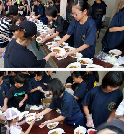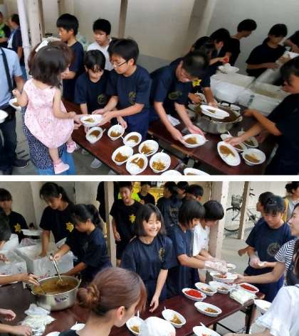 新東三国小学校での校庭キャンプです。ジュニアリーダーが作ったカレーライスを手渡します。