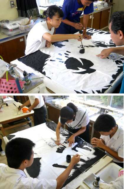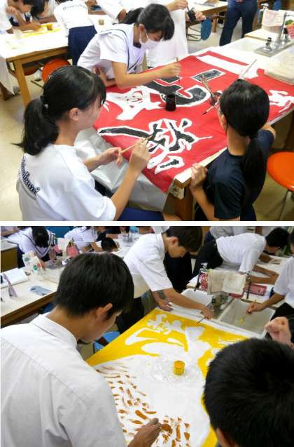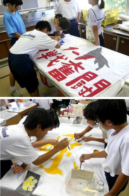 すべての学級の代表が、理科室で体育大会の学級旗を作っていました。いろいろなデザインで仕上がりが楽しみです。