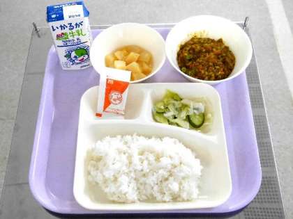 今日の献立は、大豆入りキーマカレーライス、グリーンサラダ、白桃(缶)、牛乳でした。