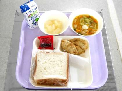 今日の献立は、食パン、いちごジャム、牛乳、あげぎょうざ、中華煮、和なし(缶)でした。
