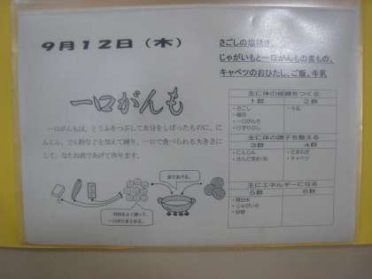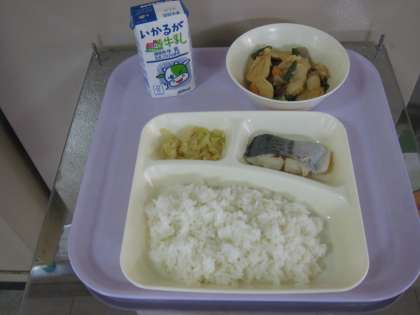 今日の献立は、ごはん、牛乳、さごしの塩焼き、じゃがいもと一口がんもの煮もの、キャベツのおひたし でした。