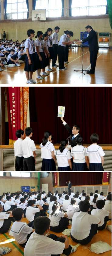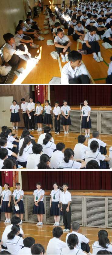 全校集会がありました。昨日、新東三国地域の敬老会で、地域ポスターの表彰をおこないました。校長先生からは、今月の品格教育のテーマ「協力」についてお話しました。努力は足し算、協力は掛け算です。協力すると倍倍と増える反面、ゼロの人がいて掛けるとすべてゼロになりますね。体育大会、文化発表会にむけて、協力してがんばってほしいですね。