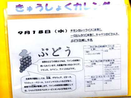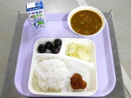 今日の献立は子どもたちの大好きなカレーライスです。献立は、チキンカレーライス、一口ヒレカツ、キャベツのピクルス、ブドウ巨峰、牛乳です。季節のくだものおいしいですね。
