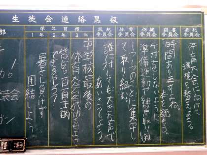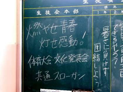 生徒会の黒板に、今年の体育大会と文化発表会のスローガン「燃やせ青春 灯せ感動!」が書かれています。また、生徒会の各種委員会からの報告があります。
