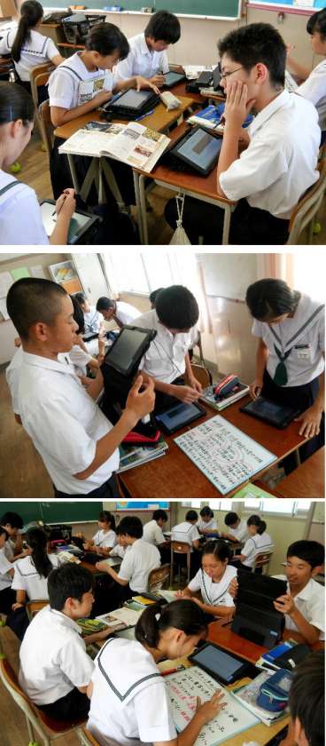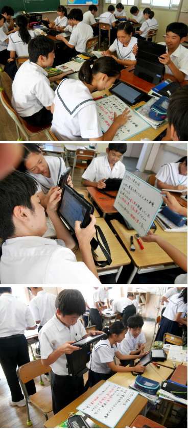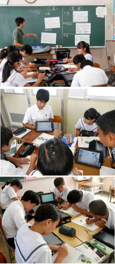 1年生の社会の授業では、北陸の工業、中央高地の工業、北陸の農業、中央高地の農業、東海の農業について、調べ学習をしていました。各班に分かれて、タブレットで調べてまとめをホワイトボードにしていました。そのホワイトボードをタブレットで写真撮影をしてから、班のメンバーが分かれて集まって、各班で調べたことを皆に説明して伝えていました。これで、自分が調べた事以外のすべてを知ることができます。ジグソー学習でお互いに対話しながら学習を進めています、