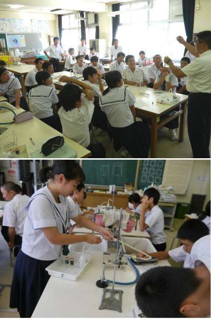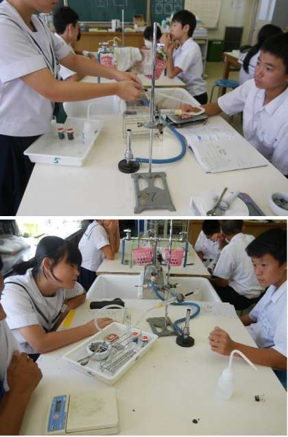 2年生が理科室で実験をしていました。酸化銅をバーナーで温めて、出てきた気体を石灰水に入れます。しっかり観察して学習しています。