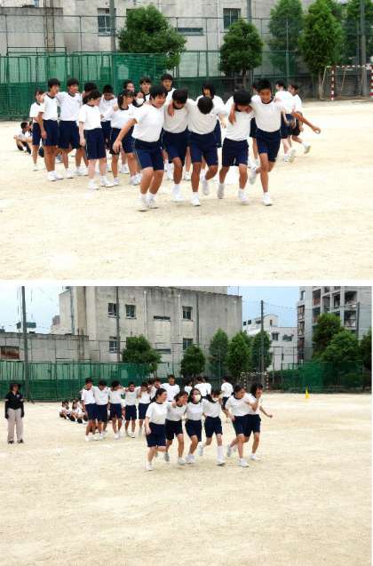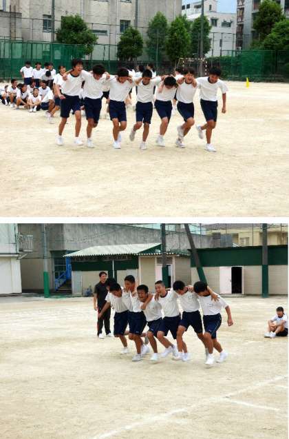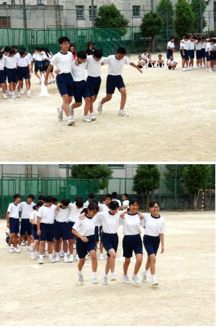 3年生が学年全員で行う団体競技の練習をしていました。「ふえる脚」は、どんどんつなぐ足が増えていくんですね。