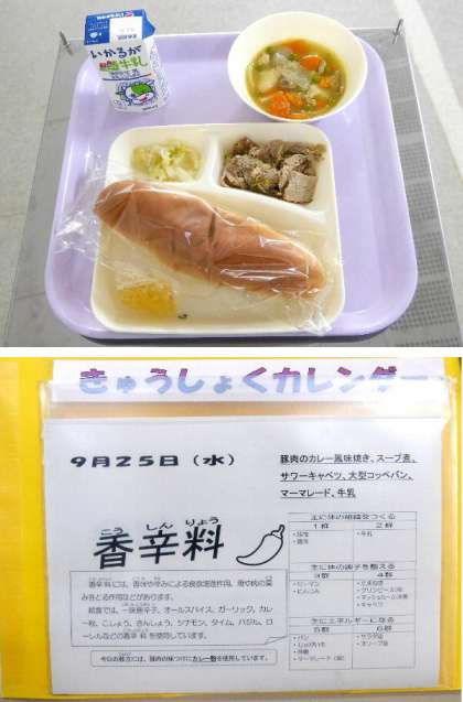 今日の献立は、大型コッペパン、牛乳、豚肉のカレー風味焼き、スープ煮、サワーキャベツ、マーマレードでした。