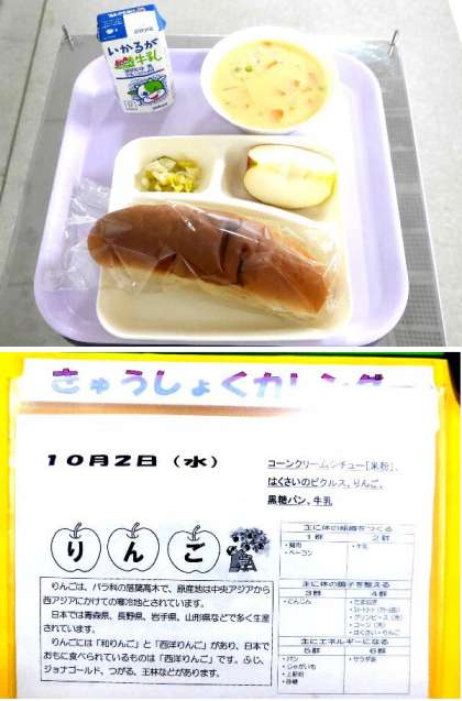 今日の献立は、黒糖パン、牛乳、コーンクリームシチュー、白菜のピクルス、りんごでした。