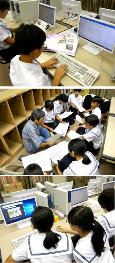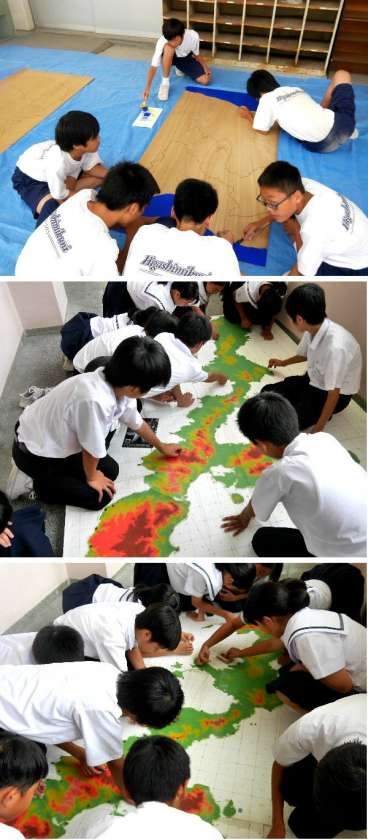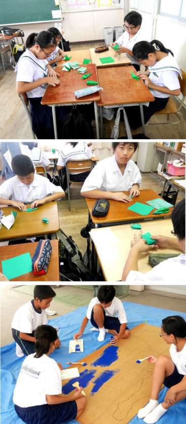 1年生が、中学校での初めての文化発表会の展示作品の制作がスタートしました。パソコンで調べたり、千羽鶴を折ったり、土台にペンキをぬったり、発砲スチロールの型をとったりと、役割に分かれて全員で作っていきます。