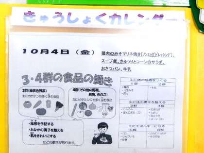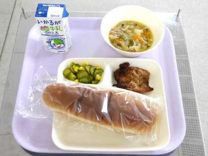 今日の献立は、おさつパン、鶏肉のみそマリネ焼き、スープ煮、きゅうりとコーンのサラダ、牛乳でした。