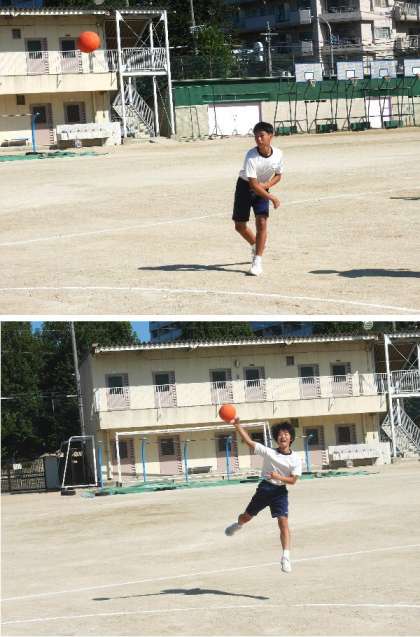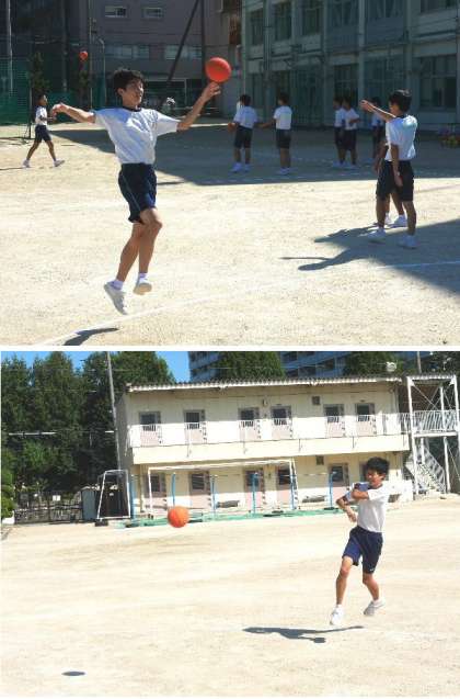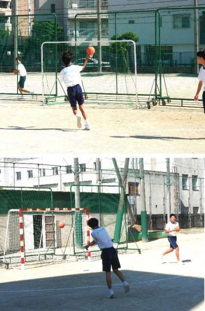 3年生の男子の体育では、ハンドボールの練習が始まりました。ボールをゴールにシュートする練習をしています。