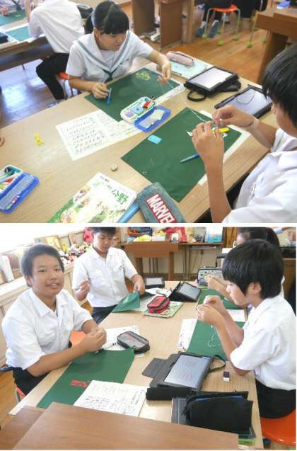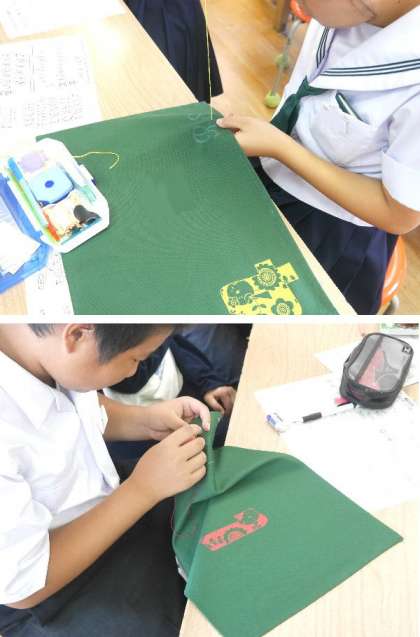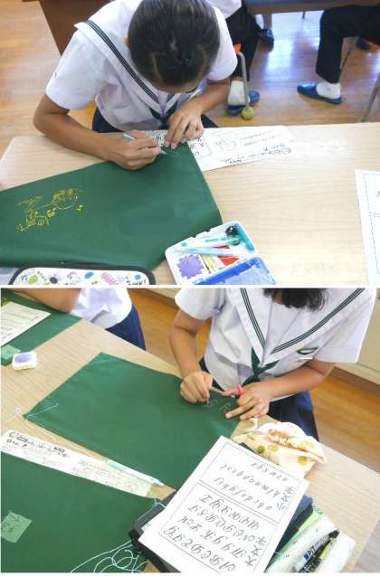 1年生の家庭科ではランチョンマットを作っていました。完成したので、自分のイニシャルを刺繍でいれています。