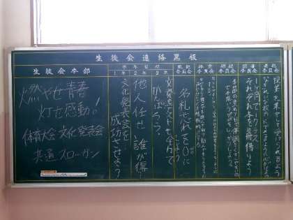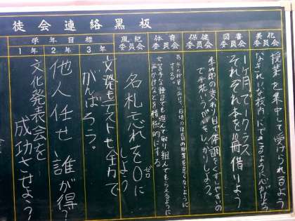 生徒会の連絡黒板に、後期の委員会の活動について書かれています。