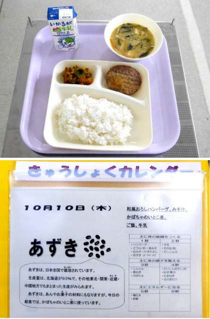 今日の献立は、ご飯、和風おろしハンバーグ、みそ汁、かぼちゃのいとこ煮、牛乳です。今日も元気アップボランティアの皆さんありがとうございます。