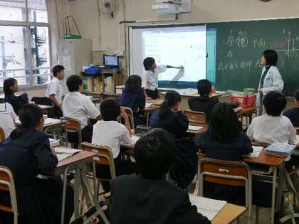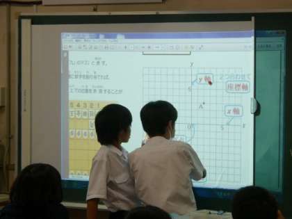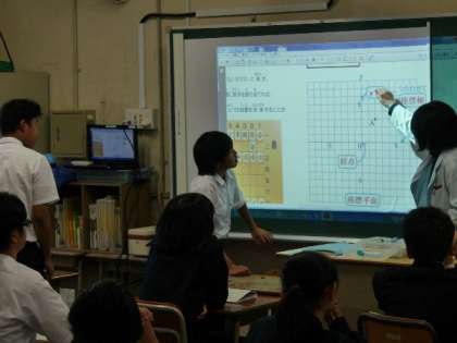 1年生の数学では、プロジェクタで関数の座標について学習していました。