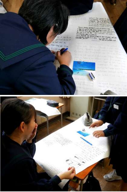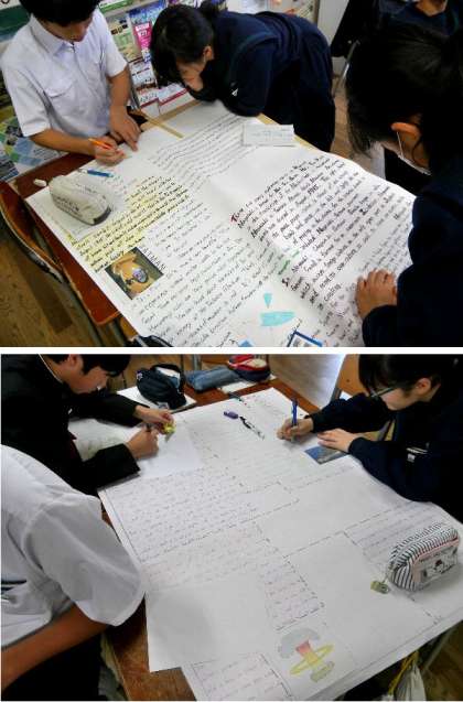 3年生の英語では、英語の壁新聞を作っています、記事をまとめて清書をしています。だいぶ完成に近づいてきました。