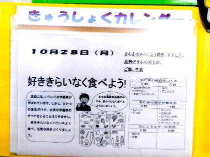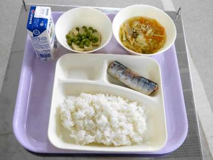 今日の献立は、ご飯、さんまのさんしょう焼き、すまし汁、高野とうふの煮物、牛乳でした。秋の味覚のさんまをおいしくいただきました。