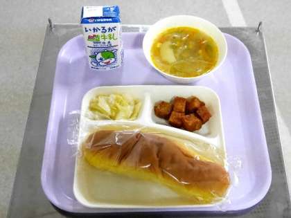 今日の献立は、パンプキンパン、まぐろのオーロラ煮、ベーコンとじゃがいものスープ、キャベツのゆずドレッシング、牛乳でした。